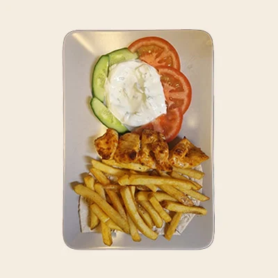Kycklingfilébitar med tzatziki, tomat, gurka & klyftpotatis