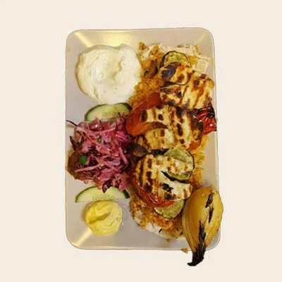 Grillad zucchini, aubergine, gul lök, tomat & champinjoner